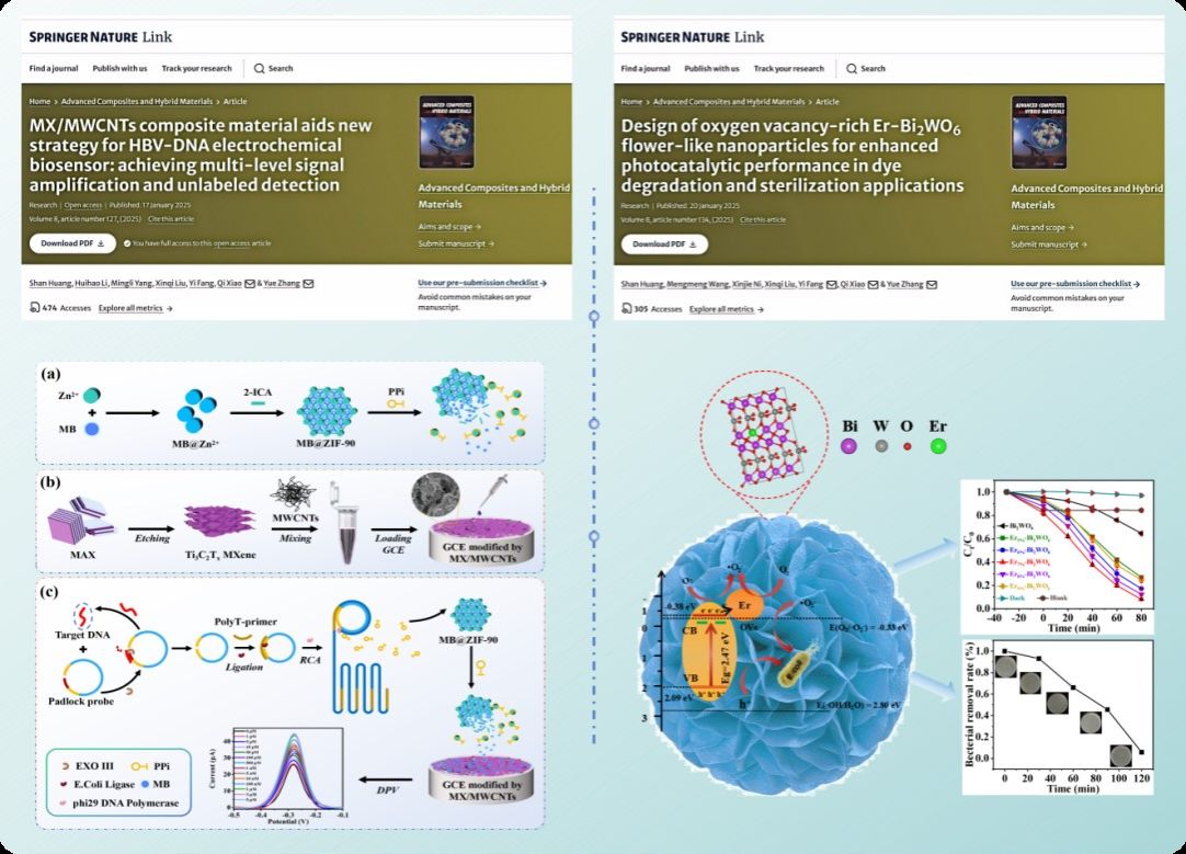 我校必赢国际bwin研究团队近期在功能纳米材料生物传感与光催化应用领域取得重要进展,两项创新成果连续发表于材料科学领域国际权威期刊《Advanced Composites and Hybrid Materials》(JCR一区,复合材料排名1/35,2024年IF 23.2)。两项成果均以南宁师范大学为第一完成单位,浙江工商大学为共同完成单位,其中黄珊教授为第一作者,肖琦教授和章悦教授为共同通讯作者,方义博士参与了研究工作。