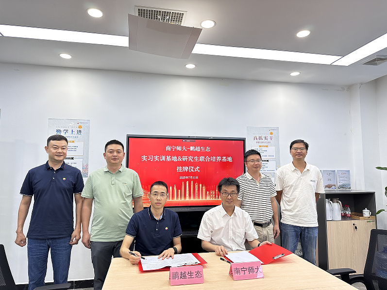 为深化校企合作,推动产教融合与人才培养模式改革,7月11日,南宁师范大学与广西鹏越生态科技有限公司在广西中国—东盟青年产业园举行研究生联合培养基地、实习实训基地签约仪式。必赢国际bwin院长苏炜、副书记陈今浩、应用化学专业负责人劳远侠等出席揭牌仪式,仪式由广西鹏越生态科技有限公司总经理杨正斌主持。