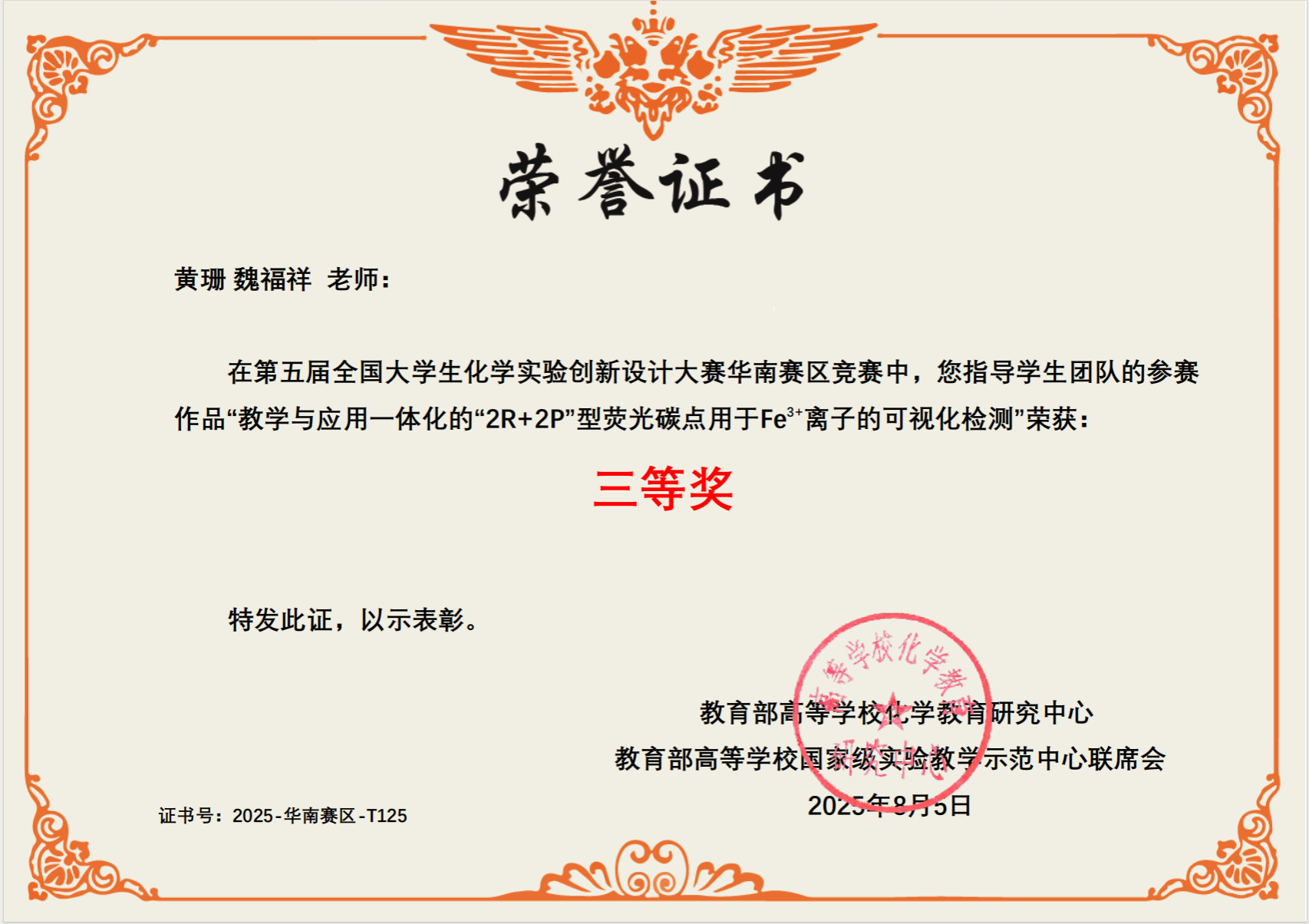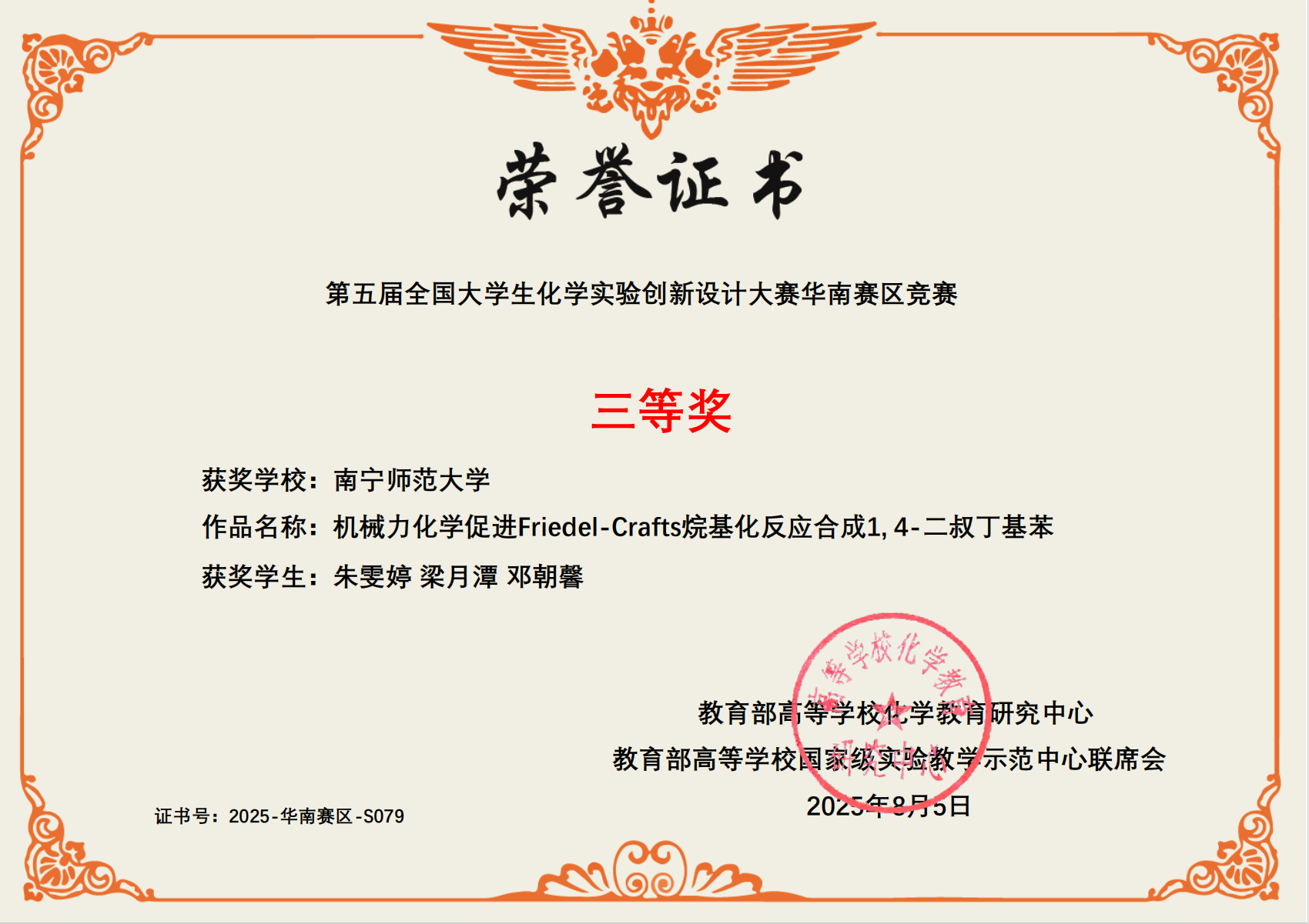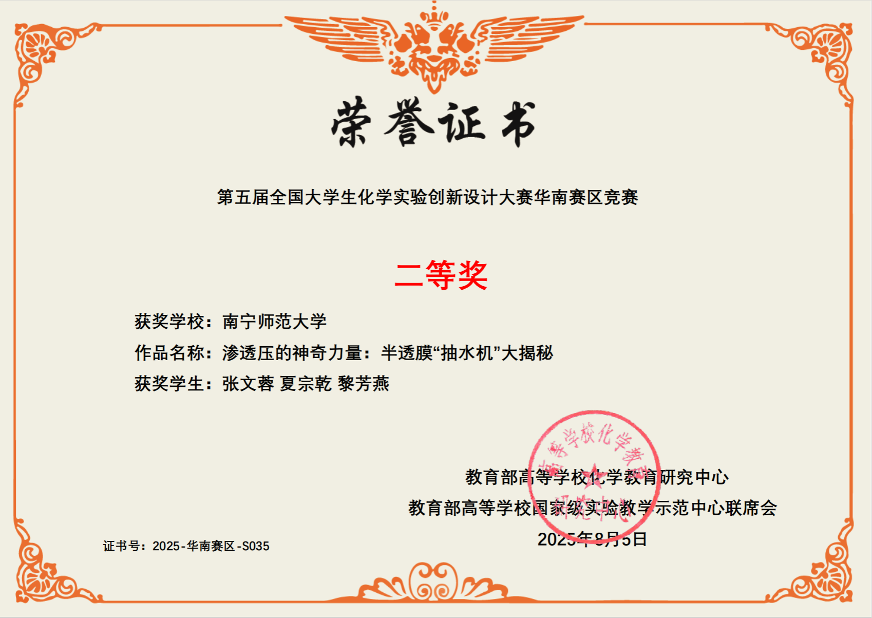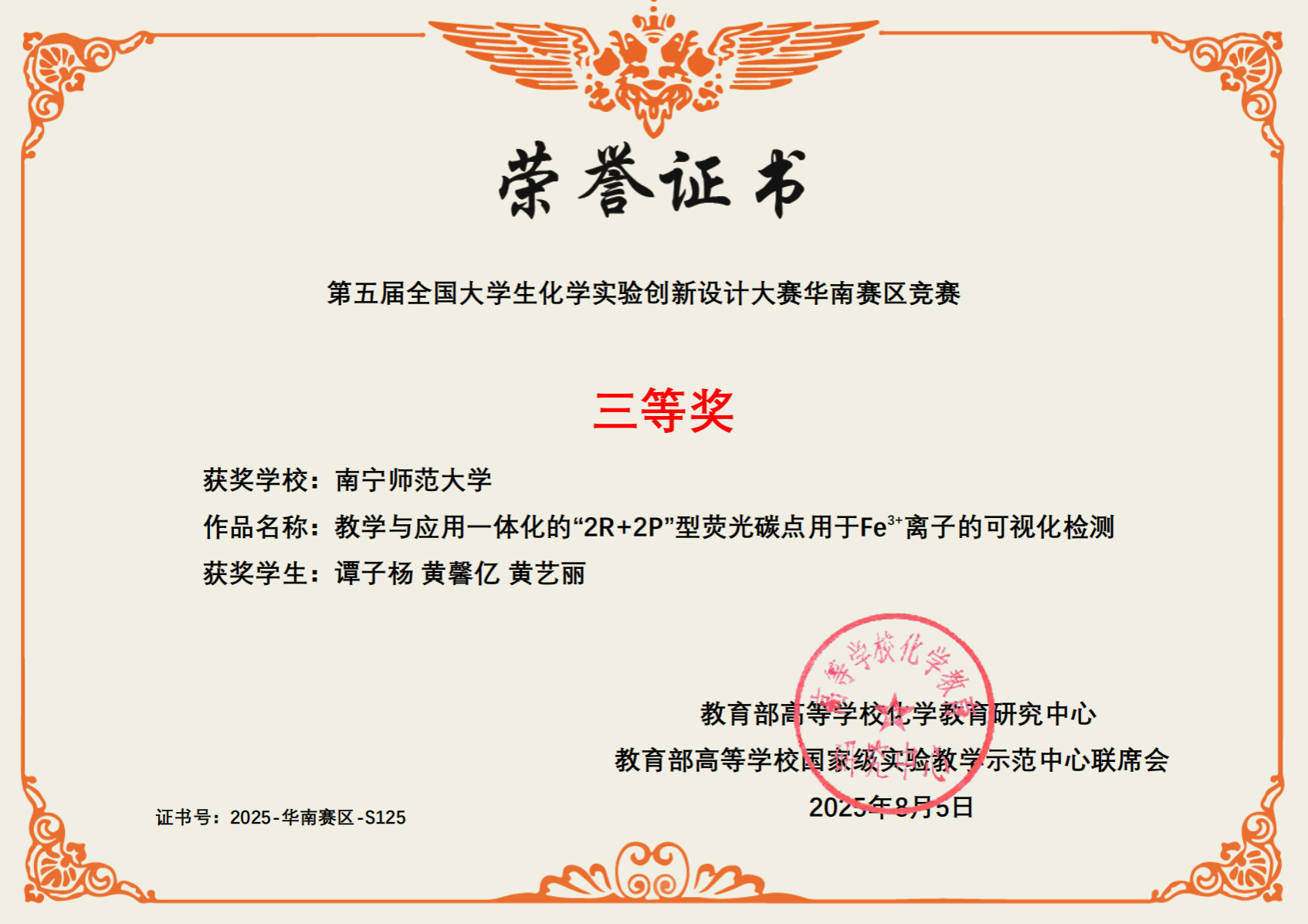 2025年7月25日至7月27日,在桂林举行的第五届全国大学生化学实验创新设计大赛华南赛区比赛中,必赢国际bwin学生张文蓉、夏宗乾、黎芳燕项目《渗透压的神奇力量:半透膜“抽水机”大揭秘》获得二等奖,学生朱雯婷、梁月潭、邓朝馨项目《机械力化学促进Fried-Crafts烷基反应合成1,4-二叔丁基苯》获得三等奖,学生谭子杨、黄馨亿、黄艺丽项目《教学与应用一体化的“2R+2P型荧光碳点用于Fe³⁺”》获得三等奖,莫启进、张丽霞、林陈想、肖军安、黄珊、魏福祥等老师获得优秀指导老师奖。